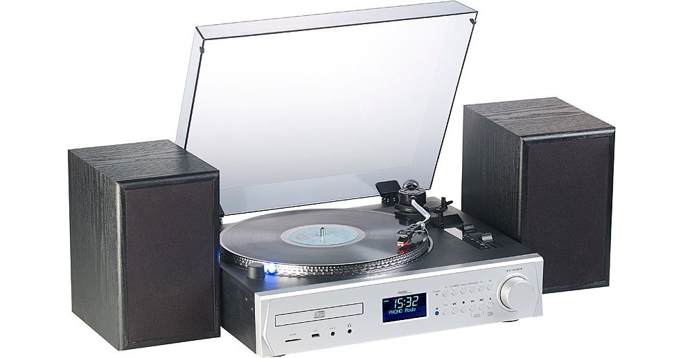 - Beim klassischen Hi-Fi-Turm werden alle Standalone-Geräte übereinander gestapelt. Das geschieht oft in einem eigenen Möbelstück (Hifi-Rack). Der Plattenspieler belegt damit automatisch die oberste Ebene. Geräte unterschiedlicher Hersteller können dabei kombiniert werden. Die Lautsprecher werden in einigen Metern Abstand aufgestellt.